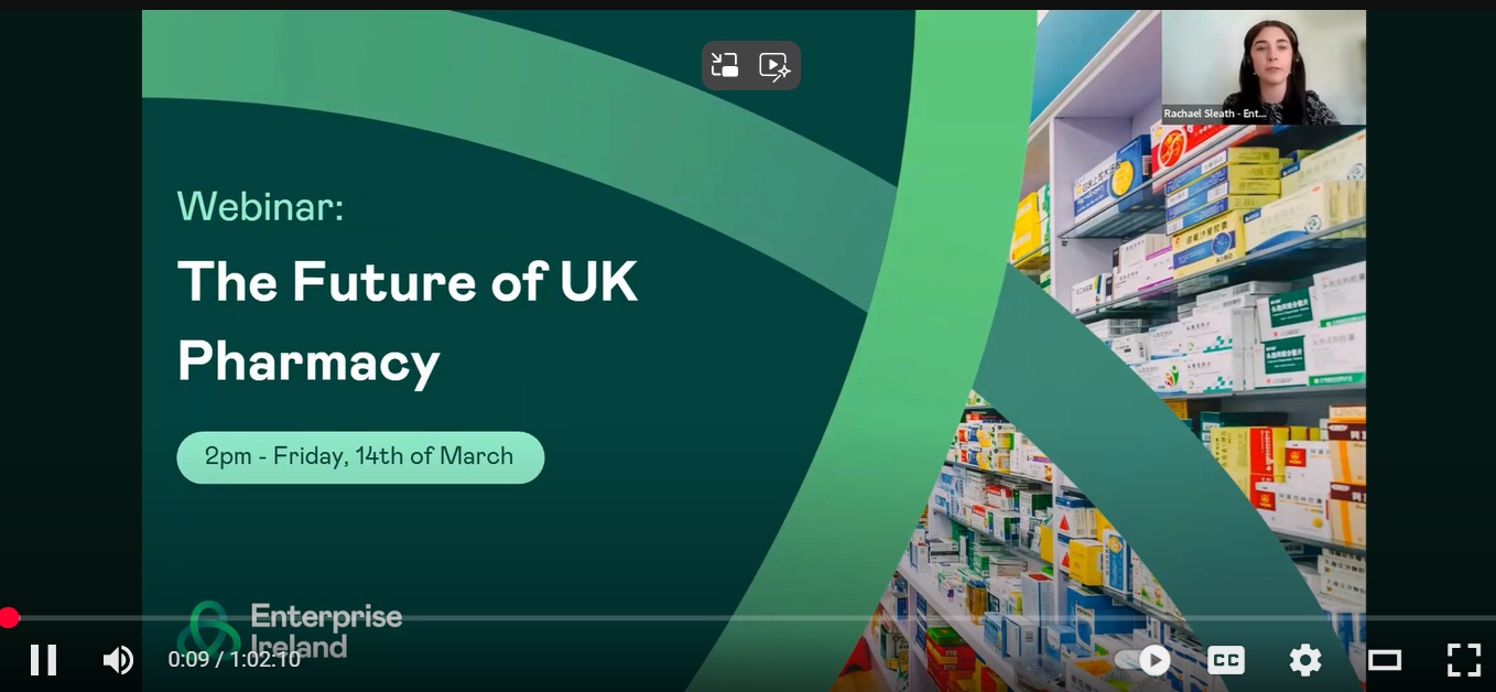 This webinar launched the Enterprise Ireland report on the UK Pharmacy Industry. The report provides in-depth insights into the sector, highlighting key market players, regulations, ongoing and predicted sector changes, and opportunities and challenges these present. The webinar provides an overview of the report, and is followed by a Q&A session with industry leaders Paul Hopkins, Ian Chamberlain, Ben Knight and Trevor Gore, and Rachael Sleath, Market Advisor of Enterprise Ireland.